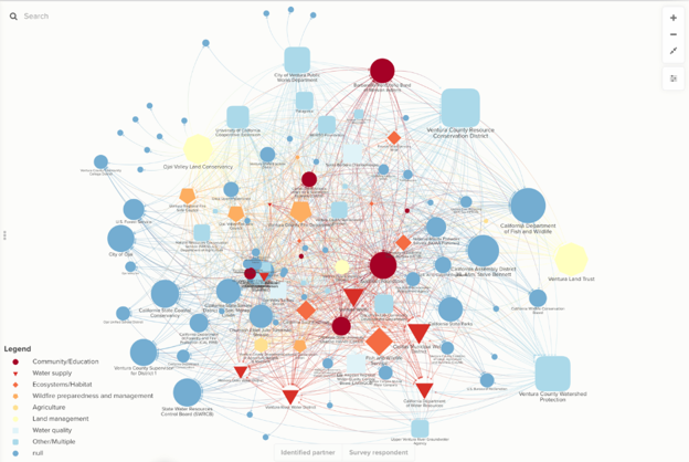 The Ventura River Watershed Resilience Project is one of five regional, community-driven efforts to strengthen watershed landscapes and networks to address water resource conservation and management in the face of a changing climate. These efforts are supported by the California Department of Water Resources’ Watershed Resilience Pilot Program. CURes partnered with the Ventura County Resources Conservation District, the Ventura Watershed Council, CSU Northridge Center for Geospatial Science and Technology, and the CSU San Bernardino Institute for Water Resiliency to apply the STEW-MAP methodology to assess the network of organizations working on water resilience in the Ventura River Watershed.